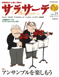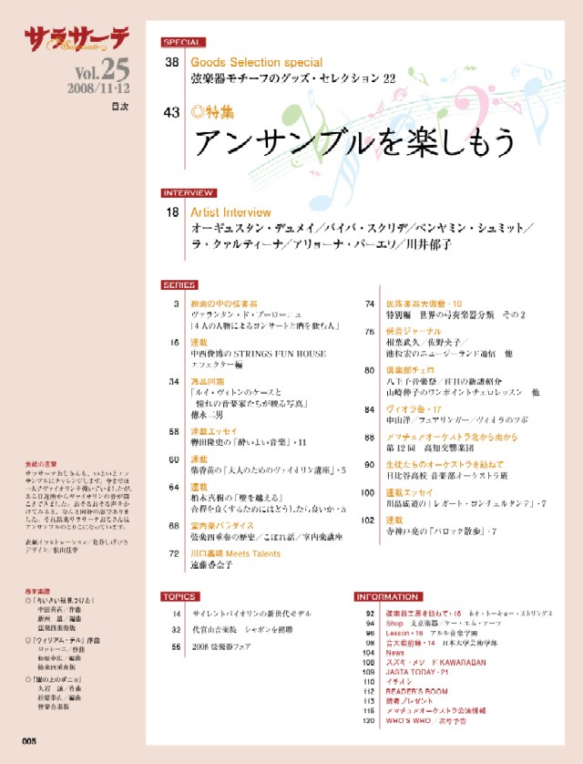 弦楽器専門誌【サラサーテ】誌上でプレリュードの商品が紹介されました。 弦楽器マガジン『サラサーテ』2008 11-12号弦楽器専門誌【サラサーテ】誌上の”弦楽器モチーフのグッズ・セレクション22”にて、プレリュードの商品が紹介されました。音楽専門誌としては珍しく、女性ヴァイオリニストをモデルにファッション誌風の楽しい記事です。誌面は欧風グッズと和風グッズの記事に分かれているのですが、両方に掲載されたのは当社のみでした。他にも、弦楽器奏者が楽しく為になる記事と美しいグラビアが盛りだくさん。管楽器奏者のプレリュード店長も思わず読み耽っています。購読されたことのない方は、ぜひ書店でお求めください。発行元:株式会社せきれい社 〒107-0052 東京都港区赤坂7-2-6 赤坂ナショナルコート410 2018.04.02 06:55 プレリュード
